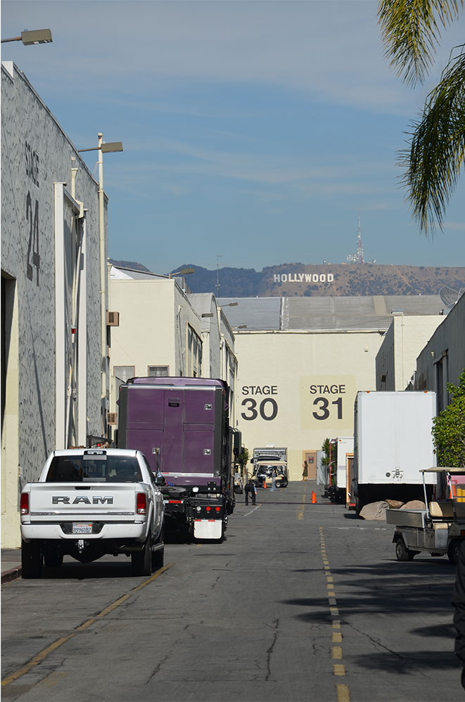 A l’entrée, un tableau nous indique les tournages en cours… Certains sont en montage avec de nombreux camions devant, d’autres sont fermés à la visite car en cours de tournage (c’était le cas du studio de This Is Us où nous avons uniquement aperçu la cantine). Au loin, le fameux signe : et oui… on est vraiment à Hollywood !
