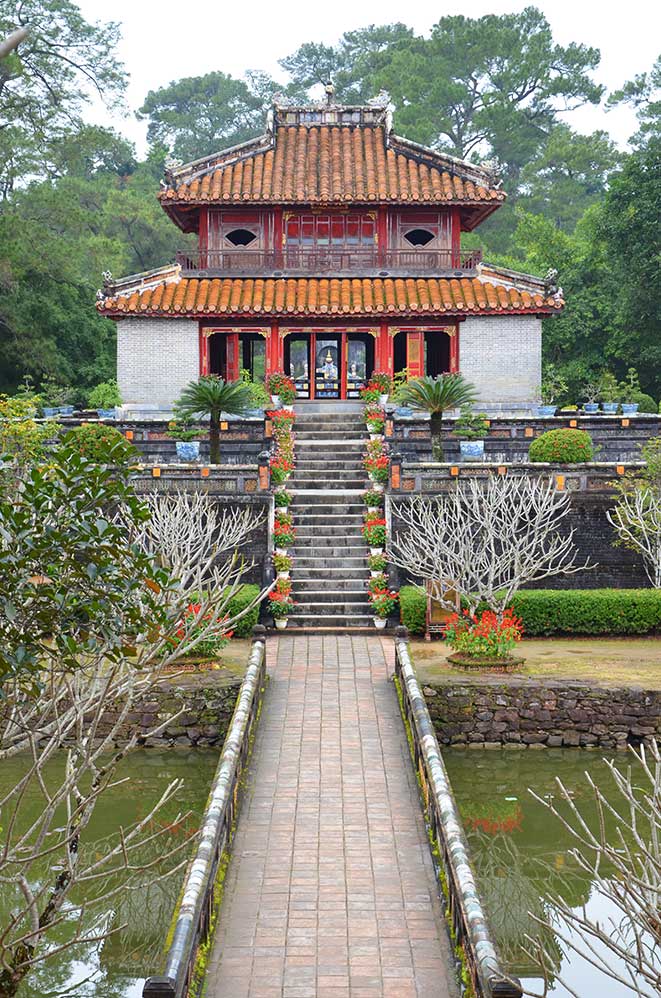 Selon la philosophie bouddhique, la vraie vie, c’est l’existence dans l’au-delà. Selon les croyances vietnamiennes, les morts continuent leur chemin après le trépas avec les mêmes besoins que sur terre. C’est la raison d’être des mausolées impériaux construits le long de la rivière des parfums, en amont de la ville de Hué. Chaque tombeau n’occupe qu’une petite partie d’un grand espace que l’on appelle mausolée, la résidence des empereurs à la campagne.