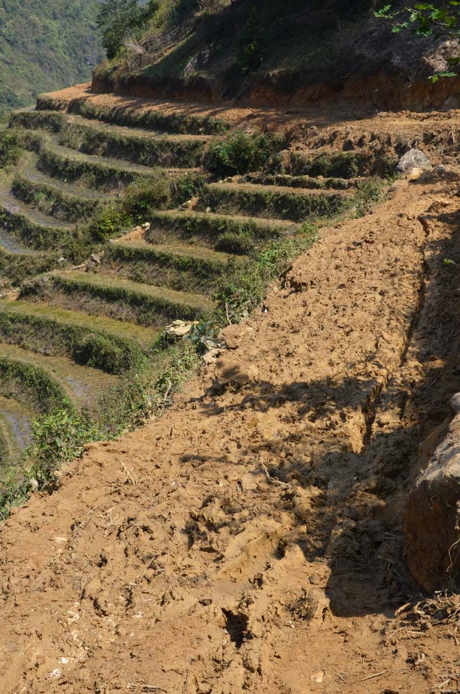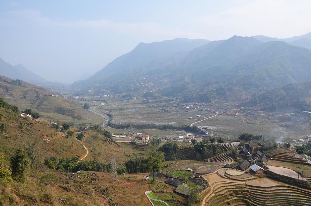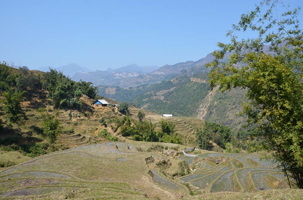Il nous faut une heure pour rejoindre cette jolie ville à 1650 m d’altitude. Entourée de hauts sommets, elle surplombe une vallée de rizières en terrasses. On ne s’y arrête que quelques minutes avant que le guide et le chauffeur nous déposent un peu plus loin sur un chemin pour rejoindre à pieds notre Ecologe à Tavan. La voiture poursuit avec nos bagages et nous descendons pour une randonnée entre les rizières.