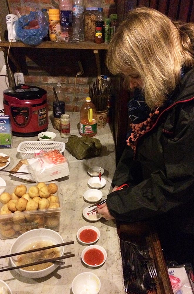 C’est dimanche et c’est Têt. Nous investissons la cuisine avec quelques voyageurs présents pour aider à préparer le dîner. On ne sait pas ce que l’on cuisine, mais on adore ça ! C’est surtout très étonnant de rentrer pour la première fois dans une cuisine vietnamienne.