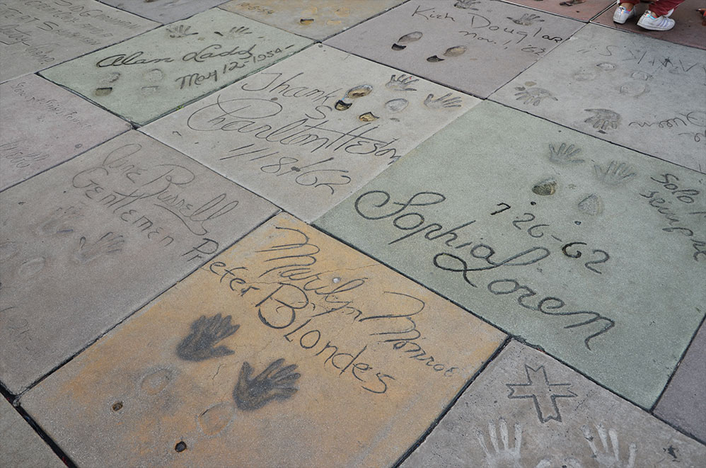 Passage au Grauman’s Chinese Theatre, lieu de toutes les grandes avant-premières. Devant, vous pouvez comparer vos mains et pieds à ceux de Michaël Jackson, Sophia Loren, Marilyn Monroe, Tom Hanks, Meryl Streep, Clint Eastwood,… entre autres !