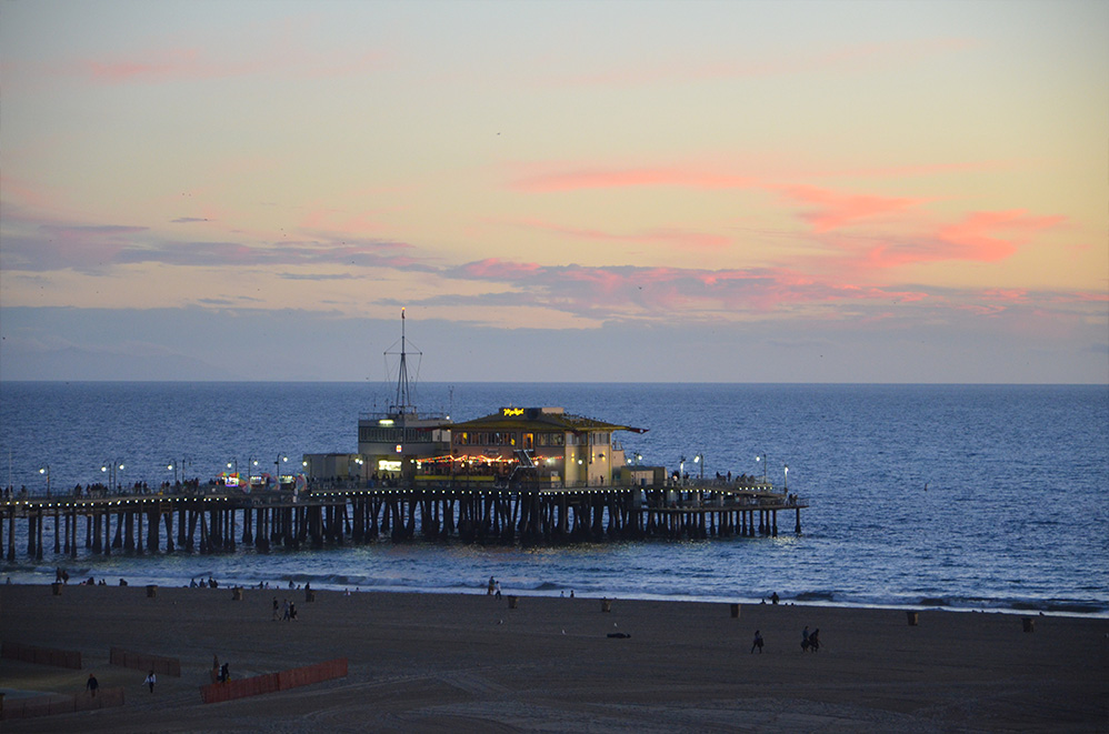 17 miles (27 km) pour traverser le centre ville de Los Angeles et plus de 2 heures dans les bouchons aurons raison de notre arrivée à temps pour admirer le coucher de soleil sur la plage de Santa Monica.