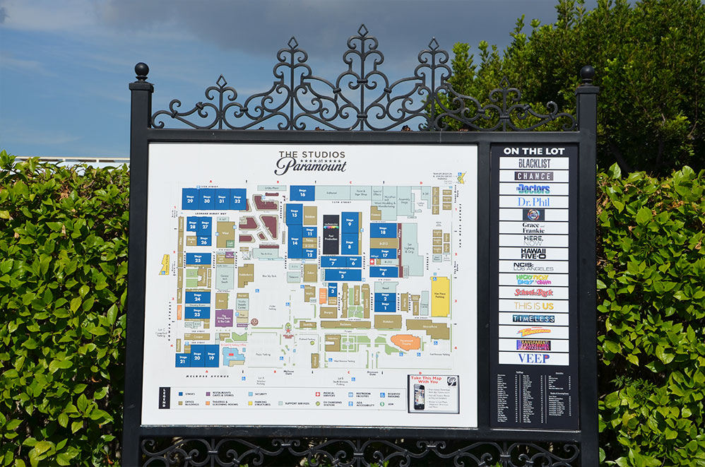A l’entrée, un tableau nous indique les tournages en cours… Certains sont en montage avec de nombreux camions devant, d’autres sont fermés à la visite car en cours de tournage (c’était le cas du studio de This Is Us où nous avons uniquement aperçu la cantine). Au loin, le fameux signe : et oui… on est vraiment à Hollywood !