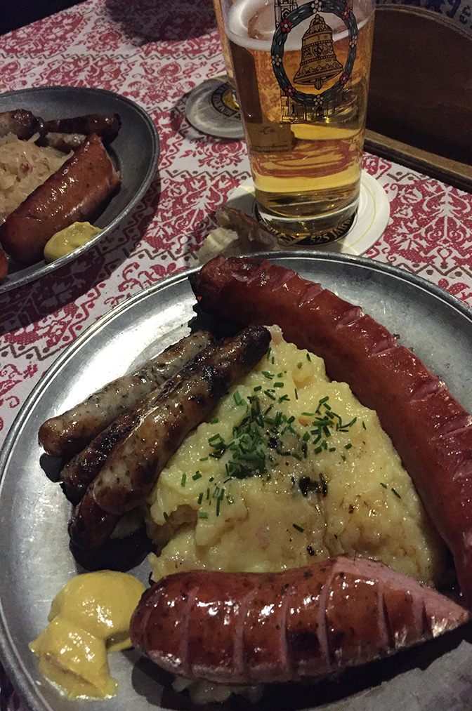 Nous voulions absolument passer notre soirée dans une brasserie allemande pour arroser nos saucisses d’une bonne pinte de bière. C’est chose faite chez Gaststatte Nurnberger Bratwurst Glockl am Dom, brasserie typiquement munichoise, à l’ambiance chaleureuse et bruyante. Ne vous étonnez pas du regard interrogateur de la serveuse bavaroise lorsque vous commandez une demie, ici la bière se boit par litres =)