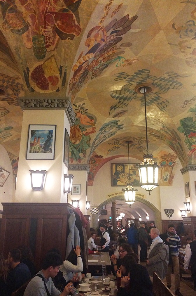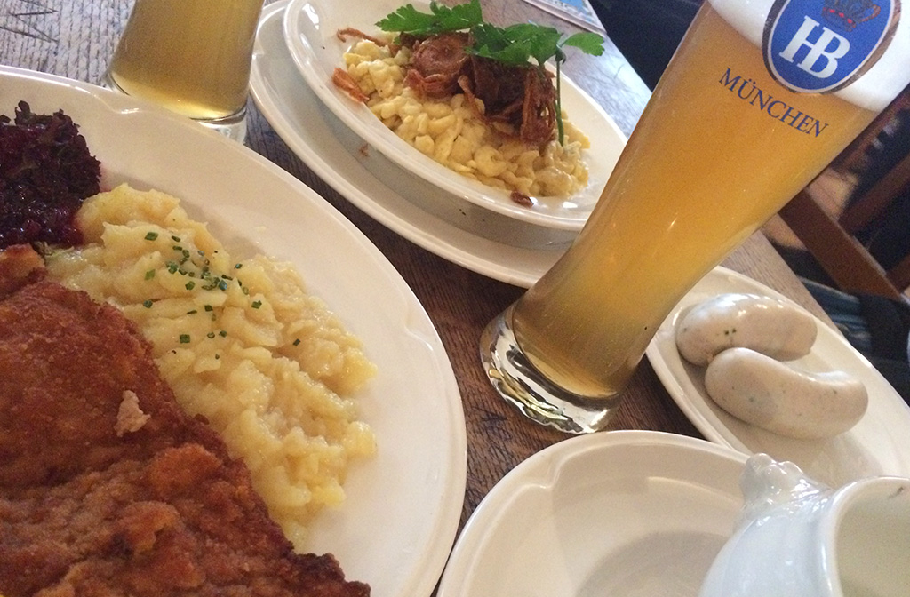 Déjeuner dans une brasserie « touristique » mais recommandée Hofbräuhaus München. Attablées une bière blonde à la main, c’est encore un festival de viandes, accompagné par un joyeux groupe de musique bavarois.