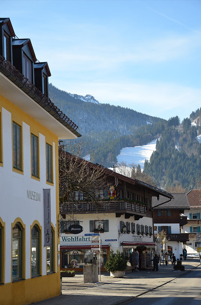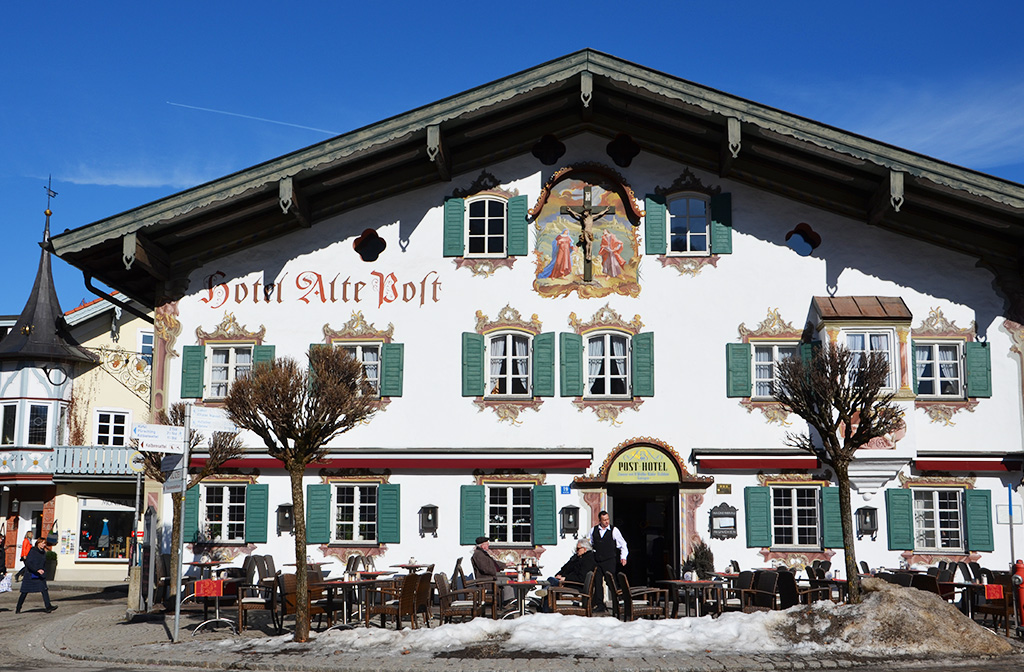 Pause déjeuner à Oberammergau, village traditionnel connu pour ses façades peintes du XVIIIè siècle qui donnent l’impression de se promener entre des maisons de poupées. Charmant !