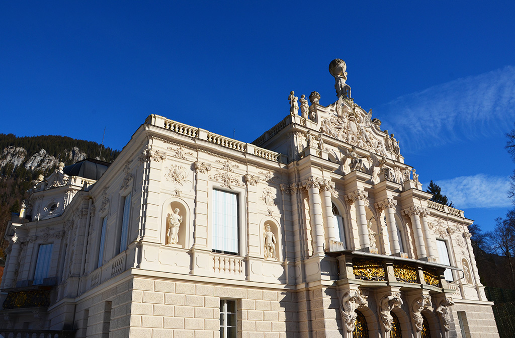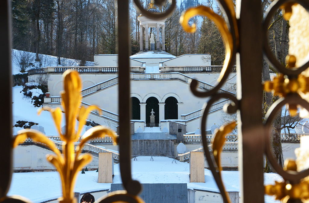 Premier arrêt dans un paysage de montagnes enneigées, au château de Linderhof. Ce château de style baroque, à l’influence très française est une ode au Roi Soleil, admiré par Louis II. Un mini Versailles : sublime !