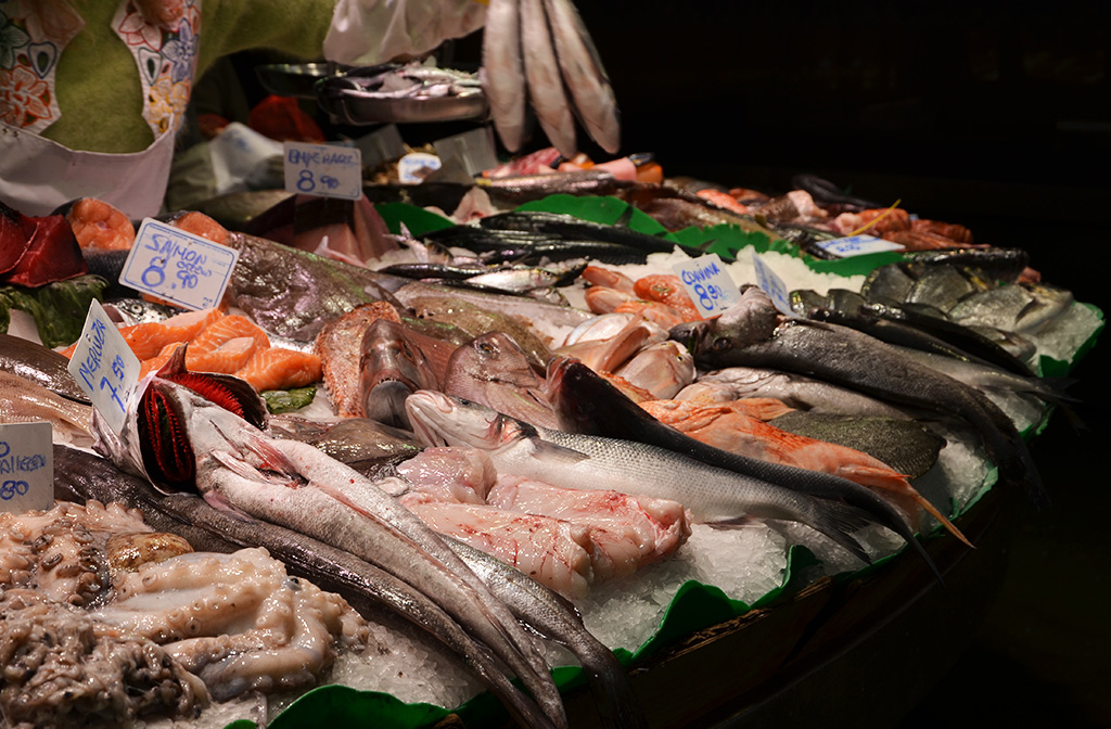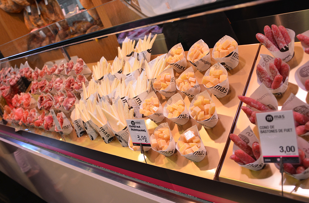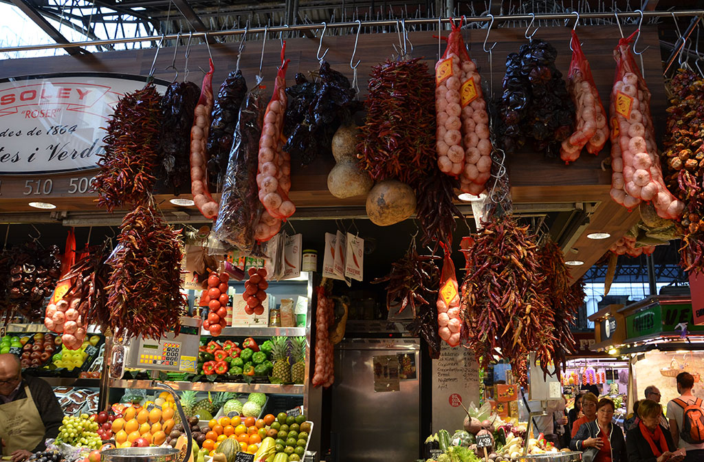 Réveil tonitruant au marteau piqueur (oh joie !), nous partons pour notre première journée Barcelonaise. Pas question de changer les bonnes habitudes, pour découvrir un pays ou une ville, nous commençons par sa gastronomie ! A deux pas de notre logement, le cœur de Barcelone : le Mercat de la Boqueria. Il est à peine 10h et pourtant tout nous fait envie : poisson, viande, fromage, tapas, fruits et légumes frais… Un vrai délice pour les yeux et les papilles !