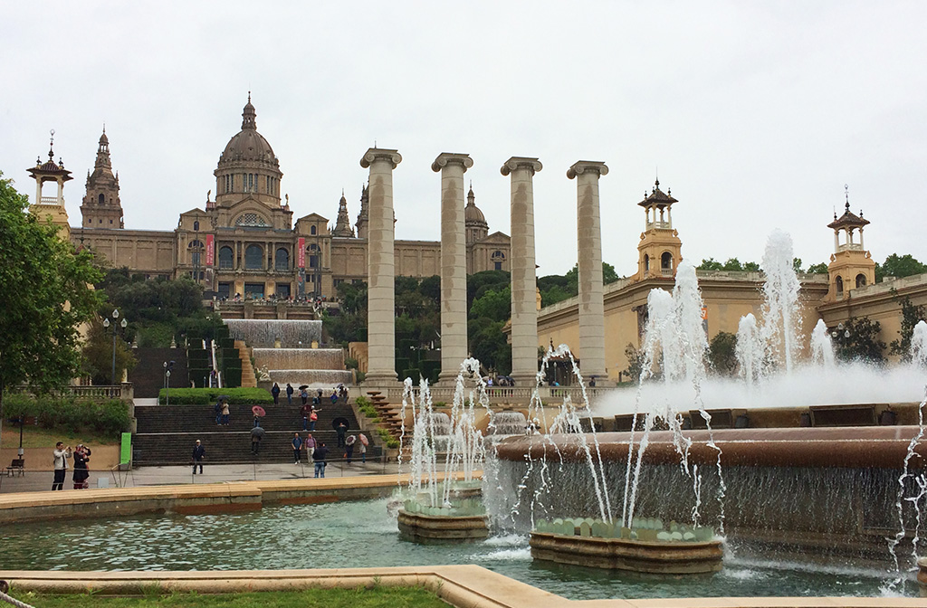Réveil sous la pluie (un comble pour un mois de mai). Rien ne nous arrête. Nous prenons le métro direction la plaça d’Espagna, un peu à l’écart du centre de Barcelone. Balade dans les jardins et fontaines du Musée National d’Art de Catalogne.