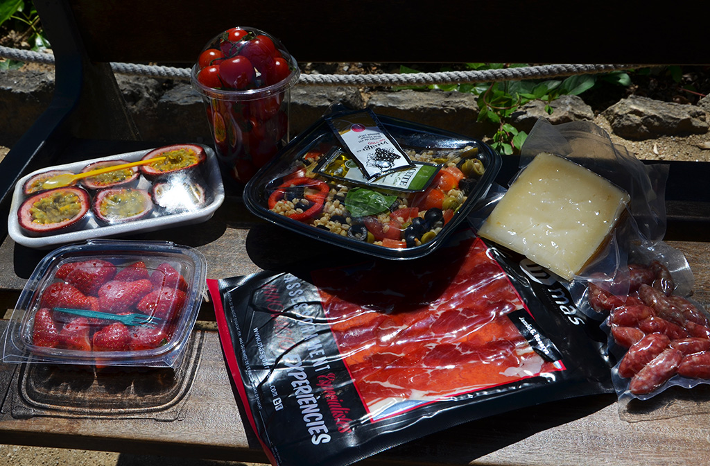En sortant, coup de bol, il ne pleut plus. Nous pique-niquons les spécialités achetées le matin même au Mercat de la Boqueria dans le parc voisin.