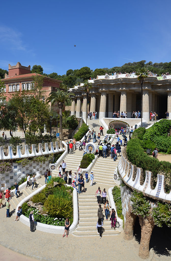 Ayant acheté notre ticket à l’avance (très conseillé), nous entrons très facilement dans le parc pour flâner quelques heures au cœur de l’œuvre monumentale de Gaudi. Artiste hors norme qui a fait de ses rêves une réalité. Pique-nique surréaliste entre une fontaine dragon en céramique multicolore et la terrasse dont la vue splendide s’apprécie assis sur le long banc tout en mosaïques multicolores. Spectacle magnifique sous un soleil de plomb. Que demander de mieux ?