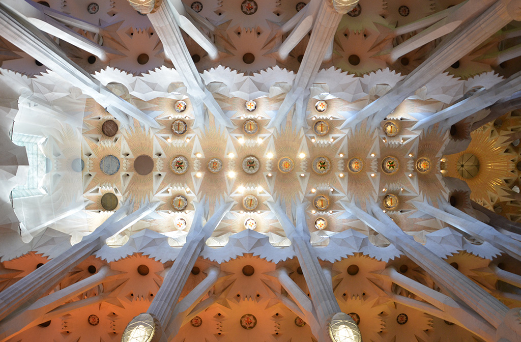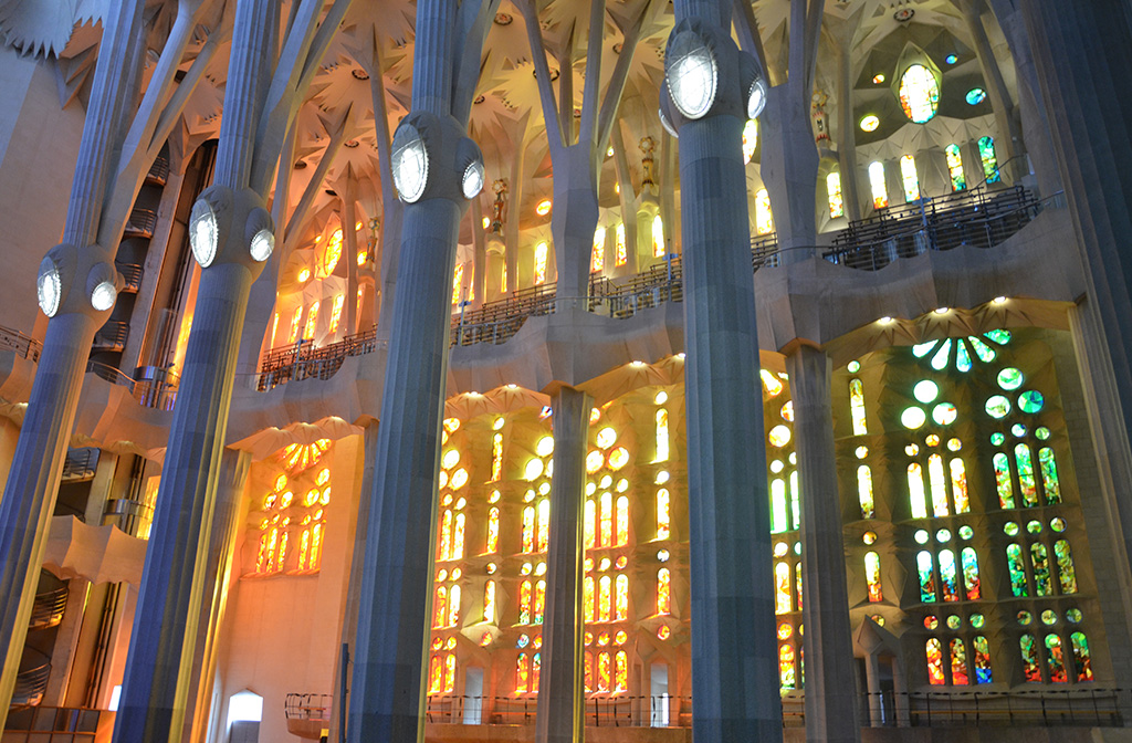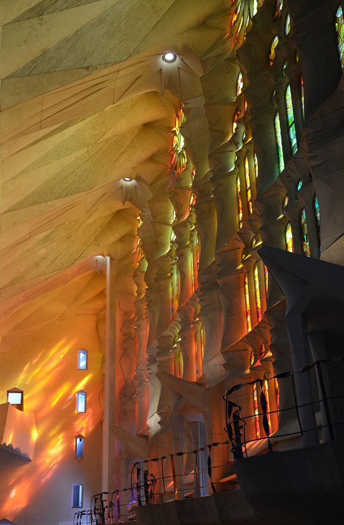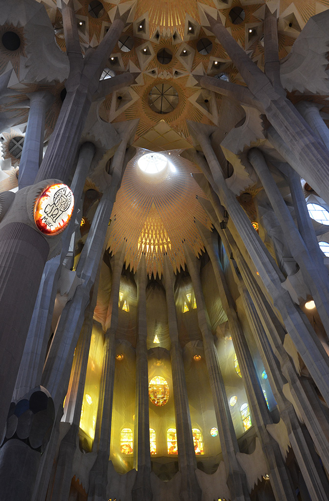 Si la façade impressionne, elle n’est rien comparée à l’intérieur de la cathédrale. Oui s’en est une, nous avons tendance à l’oublier vu l’originalité de l’œuvre. Une hauteur sous plafond à donner le vertige, des vitraux de toutes les couleurs, des formes architecturales sans pareilles : c’est à couper le souffle.