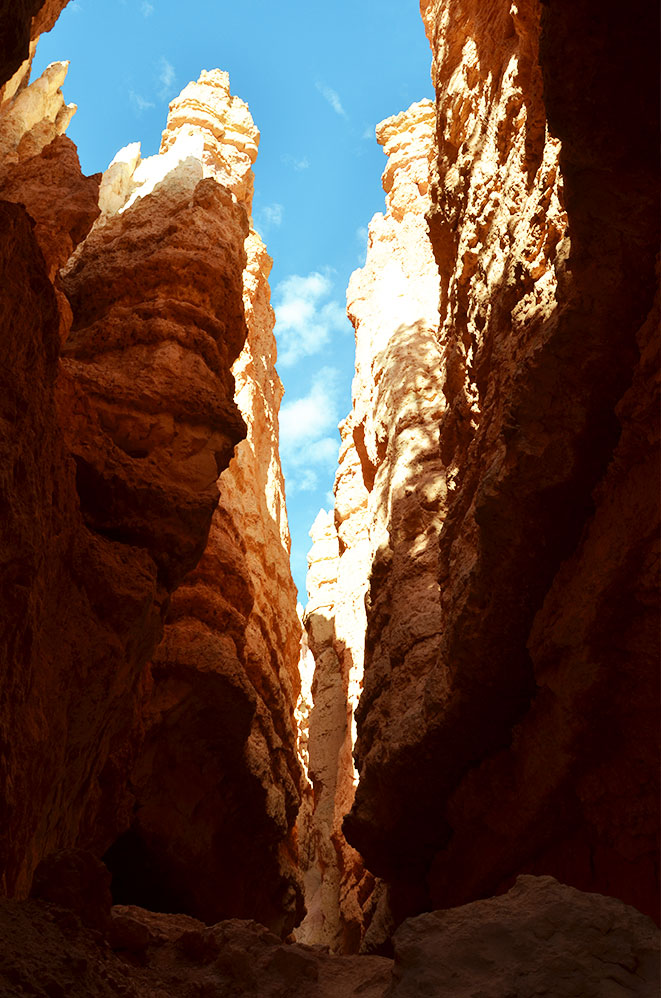 Nous passons par l’un des lieux les plus spectaculaires de Bryce Canyon, l’étroit couloir de Wall Street, un canyon en fente des plus fascinants par sa hauteur.