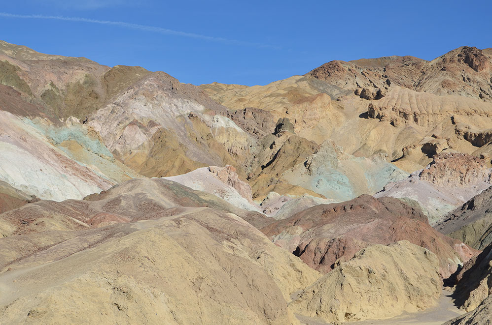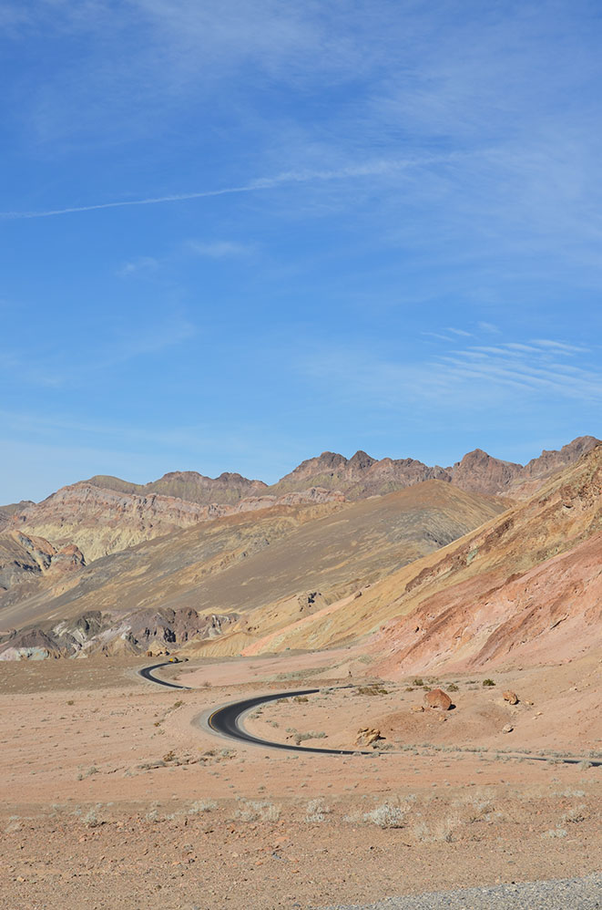 Nous continuons de remonter la Death Valley pour prendre une petite route à sens unique un peu plus loin sur la droite. C’est l’Artist Road. Une scenic road comme on les aime qui serpente dans le paysage et offre une vue sur des roches colorées grâce à l’effet de l’oxydation, formant une palette de couleurs, d’où son nom. Etonnant !