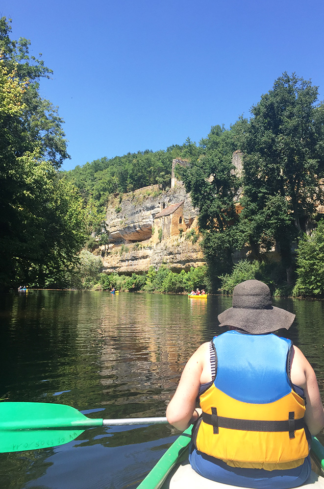 La Vézère traverse sur plusieurs kilomètres toute la vallée. Pour profiter de ces derniers moments en Dordogne, nous avons opté pour une journée sportive en canoë sur 14 km. Pique-nique dans le sac à dos, nous partons vers 10h avec le minibus du club de Canoë/Kayak des Eyzies-de-Tayac, direction la Roque Saint-Christophe. C’est là le départ des 14 km. La descente se fait à notre rythme jusqu’au point de départ. Nous avons pris notre temps pour une expérience sportive agréable sous la chaleur de la Dordogne.
