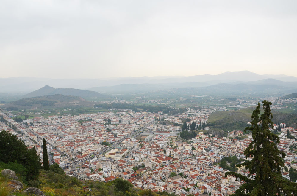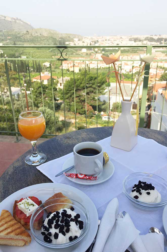 Le petit-déjeuner, servi sur la grande terrasse est gargantuesque chez Iliothea. Énorme coup de cœur pour la marmelade d’orange préparée par la maman de la maison, avec les oranges du jardin. Nous avons du mal à nous mettre en route après avoir tant mangé. Nauplie est dans la brume et on nous explique que le sable du Sahara en est le responsable, véridique ?