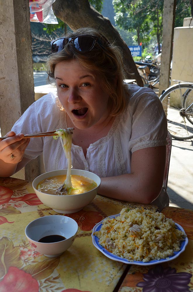 Sur l’heure du déjeuner, après avoir emprunté des vélos au Tam Coc Garden pour rejoindre le centre-ville, une pause s’impose dans un petit bouiboui. A en juger par la photo, je me suis régalée, c’était délicieux !