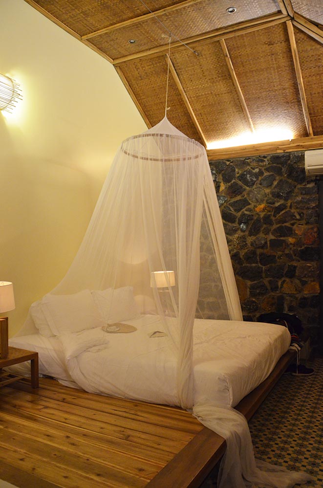 Nous dînons local mais très élaboré au restaurant de l’hôtel. A notre retour dans la chambre, une moustiquaire a été installée au-dessus du lit et un conte vietnamien, traduit en français, déposé sur le lit. Cette attention rend le moment encore plus magique qu’il ne l’était déjà.