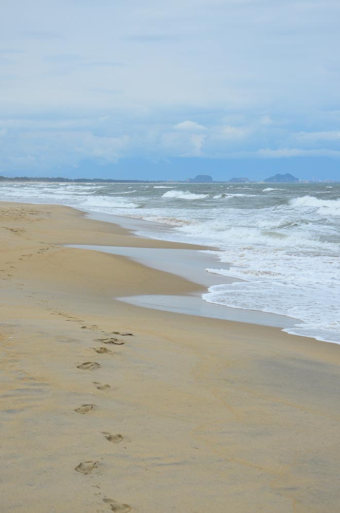 Nous passons la matinée à la plage de Cura Dai, la plus belle plage de sable du coin. Et elle était très propre, ce qui n’est pas forcément une habitude des plages vietnamiennes. Il ne faisait pas assez chaud pour se baigner (en février), mais la farniente sur le sable était très agréable ! (MAJ du 27/10/2019, la plage de Cura Dai n’est plus accessible… Pour limiter l’érosion, des gros boudins ont été installés tout le long de la plage… Merci Emilie pour l’information).