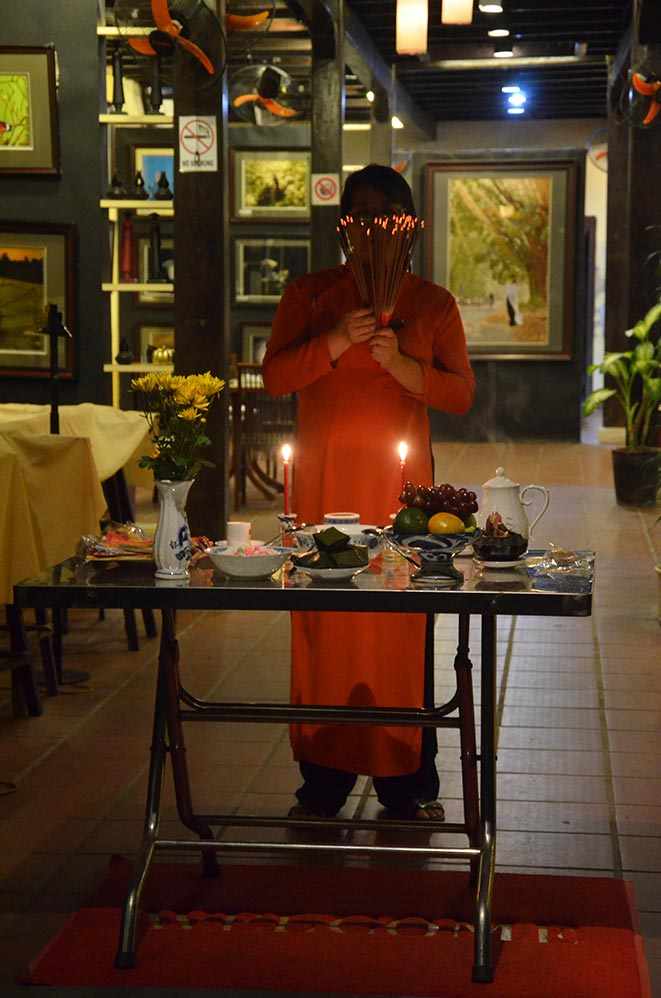 Devant les entrées des maisons et des boutiques sont dressées des petites tables d’offrandes. Les habitants en signe de sagesse sont invités à allumer des bâtons d’encens et des bougies.